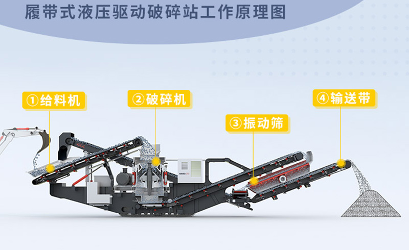 以配置选搭破碎主机为颚式破碎机的履带移动式破碎站为例,当其工作时,物料经给料机均匀输送到破碎机内,颚式破碎机作初步破碎后,通过圆振动筛构成闭路系统,实现物料的循环破碎,成品物料由输送机输出,进行连续破碎作业。