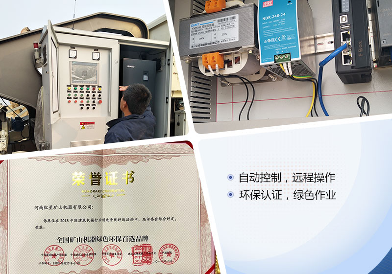 b) 自动化工作流程:移动式砸石机配置PLC控制系统,融合数字化操控技术,一键启动,灵活方便,当设备出现运转异常时,能第一时间发出警报,通知操作者,PLC系统能及时掌握机身压力、润滑油温。
