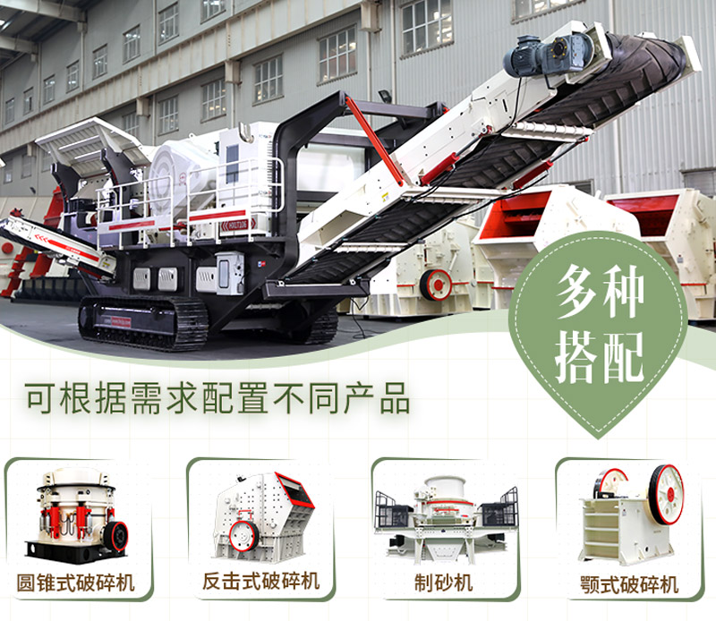 反击式移动破碎机、圆锥式移动破碎机、锤式移动破碎机等,可以多机组合搭配,组合过程简单方便,有效实现机组一体化、配置多样性,适用范围更加广泛、灵活。不同配置,不同的生产需求,满足您的多样化需求。