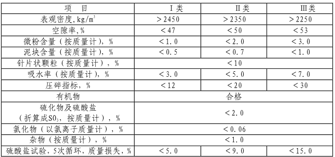 《混凝土用建筑垃圾再生粗骨料》中对“混凝土用建筑垃圾再生粗骨料”定义为:由建(构)筑废物中的混凝土、砂浆、石、砖瓦等加工而成,用于配制混凝土的粒径大于4.75mm的颗粒;并按照性能将其分为将其分为I类、II类和III类。